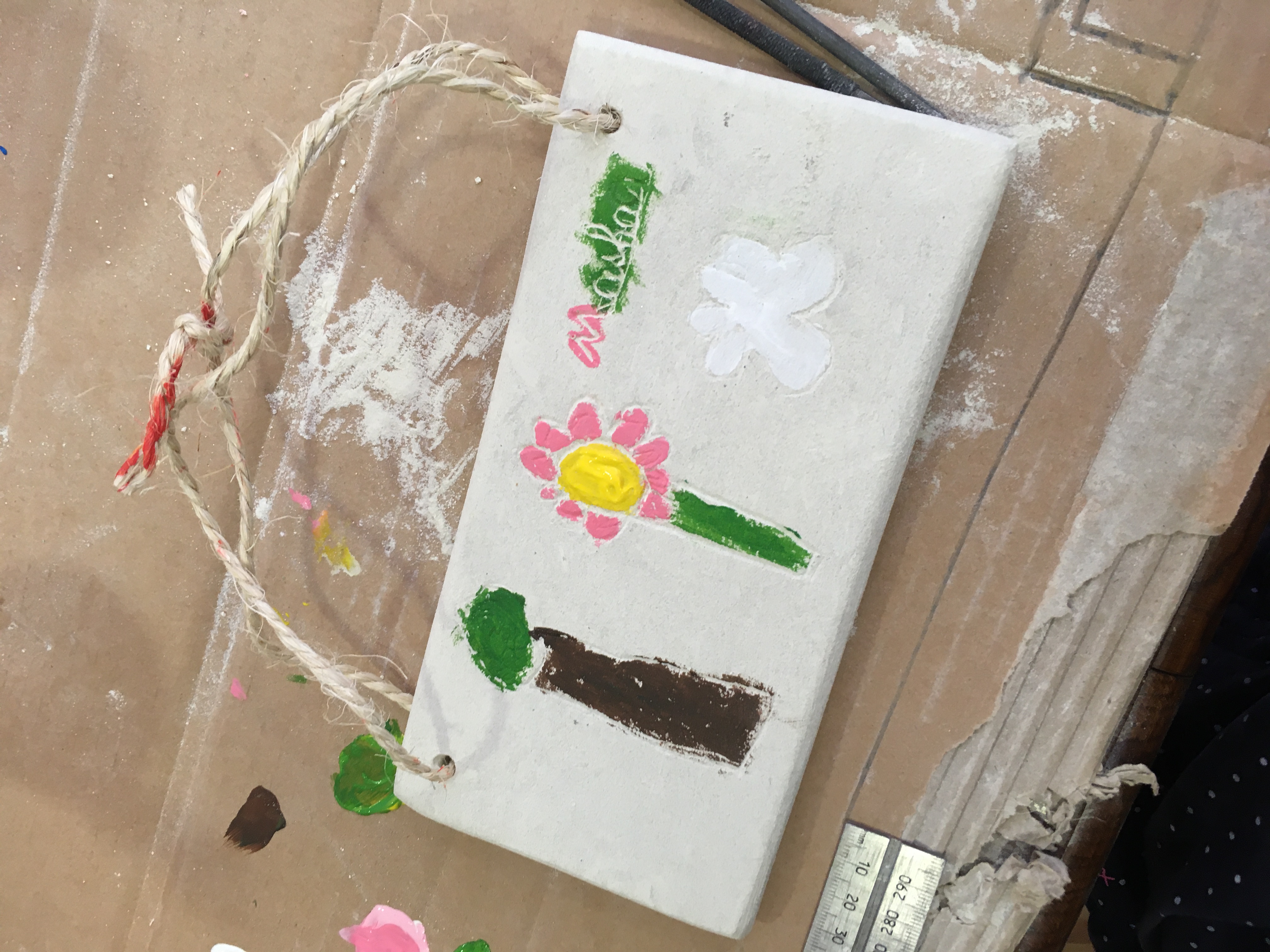 Avec les 2 ciseaux fournis, la plaque en tuffeau et la peinture, les enfants y passent des heures ! (à vous la pause café !) .